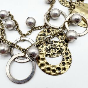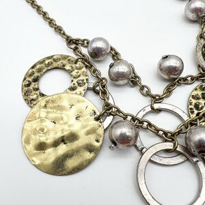 This Layered Hammered Gold Tone and Silver Tone Metal Medallion Beaded Statement Necklace features a bohemian-inspired design with a mix of silver and gold tones.