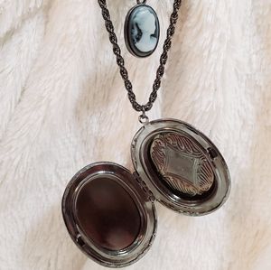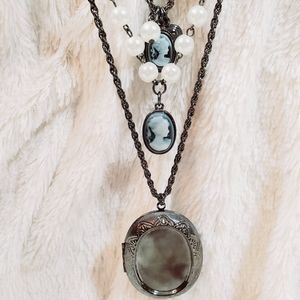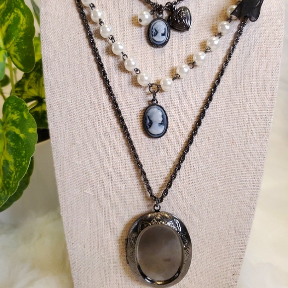Three-layered necklace with large locket, faux pearls and antique silhouettes.