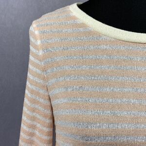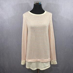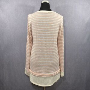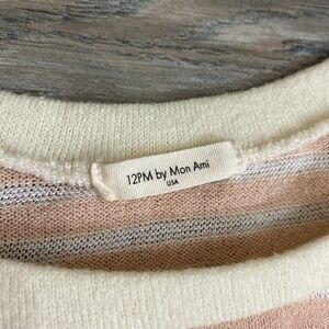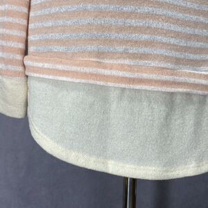 Cream and peachy pink horizontal stripes with layered look. Curved hem.