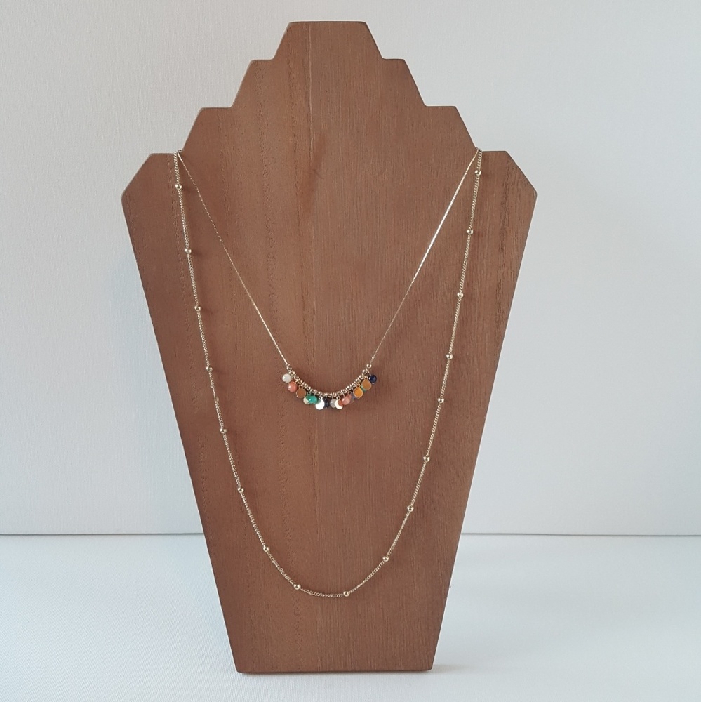 Beeline Layered Multi-Color Pastel (Coral, Lavender, Sea Foam, Navy and White) Long Necklace on Gold Chains. Short Layer approx. 18" Long Layer approx 24". Lobster Clasp