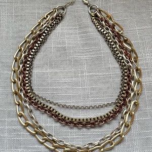 Chunky layered chain necklace. Pale gold, silver and rose gold chains with a lobster clasp with extender chain. Very versatile, dress up or down. Nice quality weight to it. Like new. Shortest chain is 18” with a 3.5” extender chain. Thanks for looking!