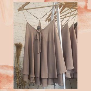 This sassy little razor back tank is complete with a plunging V-neck, tie and adjustable straps. With a layered ruffle effect. Perfect for summertime concerts and get togethers.