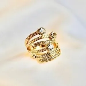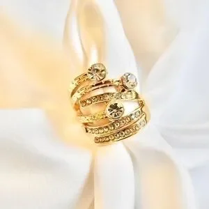 This glamorous gold ring is unique and abstract with dimensional rhinestones
