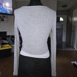Light gray layered ribbed long-sleeve top with a built-in white contrast inner panel. Soft stretch fabric for comfortable, flattering wear. Scoop neckline with small decorative metal ring accents. Easy-to-style everyday top that pairs well with jeans or skirts.