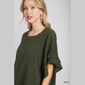 Layered Ruffle Sleeve Top / Blouse - Boxy Cut - Wide Round Neck - Olive Green
