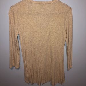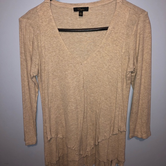 The softest sweater ever! It looks really great for business casual and dressed up. The sleeves are about mid forearm on me and the V neck is not too deep. The ruffles lay very nice, too.