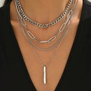 Elevate your style with this chic layered sterling silver chain necklace set. Featuring four distinct strands—a chunky curb chain, bold paperclip links, sleek cable chains, and a modern vertical bar pendant—this set creates the perfect statement look.