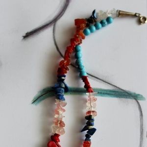 This hand-beaded multi-strand necklace is colorful and stunning. The coral beads are a beautiful dark red color with polished surfaces. The turquoise is a lighter green and blue, dark rose quartz is a deeper delicate pale pink, lapis is a darker blue - all with polished and uneven surfaces. These fantastic colors are offset with burnt orange carnelian gemstones. 21 to 23" approx. length with sterling silver findings and lobster clasp. Boho style, similar to Anthropologie.