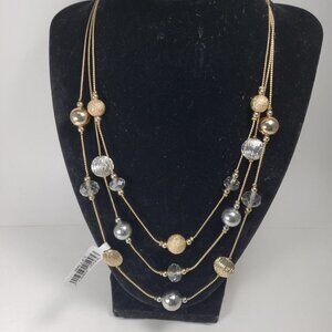 This layered strand necklace features a stylish combination of beads and textured discs in a dual-tone design. Perfect for women, this necklace adds a touch of elegance to any outfit. The necklace is new with tags (NWT), ensuring its pristine condition. Ideal for any occasion, this piece is a must-have accessory.