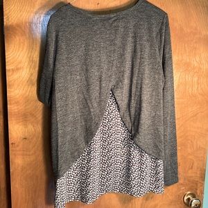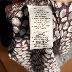 Layered connected top with beautiful back. Purple & grey accent print. Shoulder to bottom length 26”