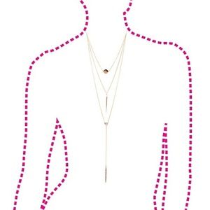 Three delicate gold toned chains dangle a circle and a pointed spear above a long rhinestone-studded Y chain with a diamante-pave spear below. Never worn.
