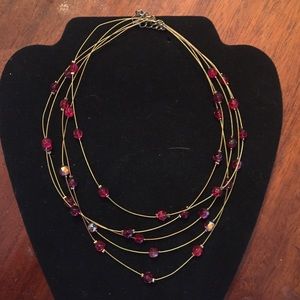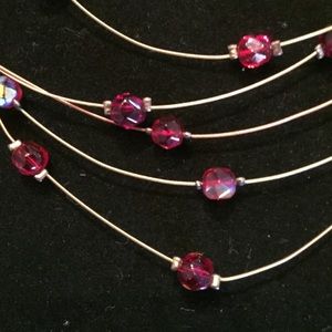 Gold colored strands with iridescent, cranberry colored beads. Adjustable lobster clasp. Designed like the illusion necklaces, but the strands are gold colored.