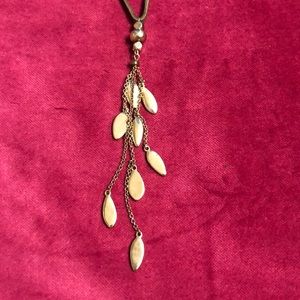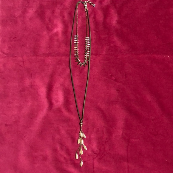 Lucky brand layers. Fun worn together or You can remove one and wear them separately! The long piece is on a leather strap. Very fun flowy necklace.
