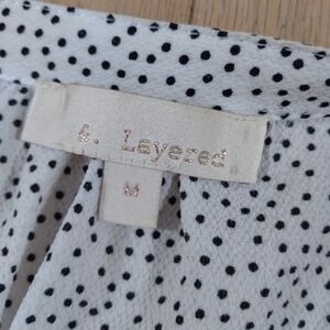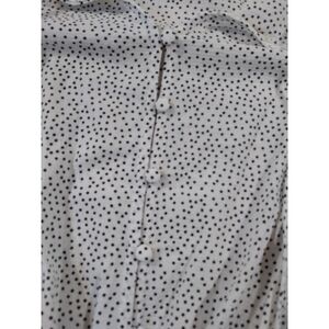 Scattered polka-dot pattern shirt with partial fabric covered button up neck and decorative ties. Elasticized sleeve cuffs and drop waist. Lightweight and classy. Great for the beach, date night or casual Fridays.