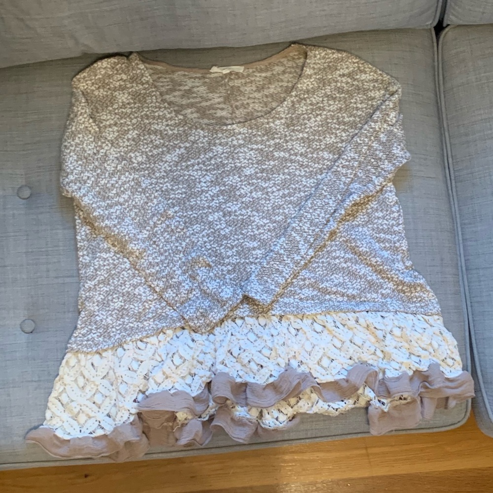 Scoop neck , knit sweater with lace ruffle detailing at bottom. Very good condition! Perfect fall sweater