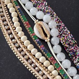 TAGS: layered cuff bracelet boho chic unisex shell bead wristband stacked beaded casual streetwear modern wristwear festival mixed materials #braceletstack #shellbracelet #layeredlook