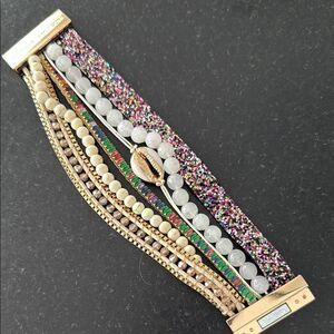 Beads, crystal, metal, and a shell accent come together in a stacked look with a magnetic clasp.