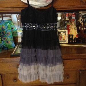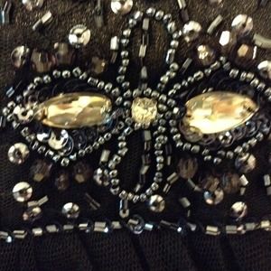 Goes from dark black to light gray. Zips and ties in the back. Beautiful beads and gems. None missing. Can't find any wears or tears!