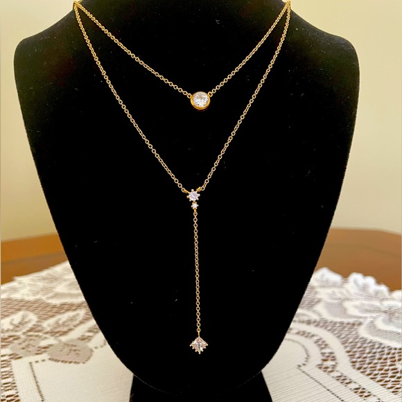 Set of two dainty gold necklaces can be worn together or separately. One is approximately 16” in length featuring a single round rhinestone and the second necklace measures approximately 18” featuring a drop diamond-shaped rhinestone. Costume jewelry. Never worn, like new.