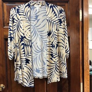 PM jacket. No lining but it is not sheer. Sleeves are shorter and gathered. It is a deep navy with a tan and white print. Would look great with whit or khaki bottoms. Front is a little longer than back which is 27 inches