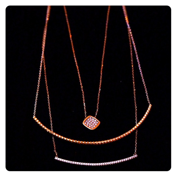 They look beautiful together, bundle price. Rose gold tone and cubic zirconia stones. One necklace is silver 925 and rose gold design.