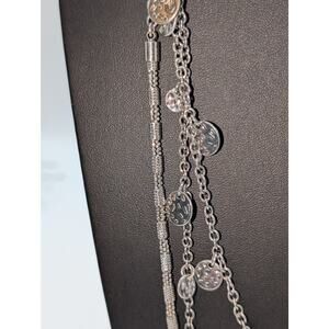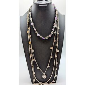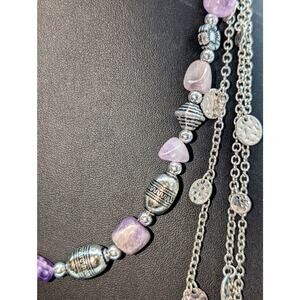 Layers of Amethyst & Silver Tone Beads & Multi Chain Dangle Necklaces. Pre-owned, both necklaces are in good condition. Three Strand chain dangle necklace is a great layering piece. The purple flower bead necklace are genuine amethyst nuggets.
