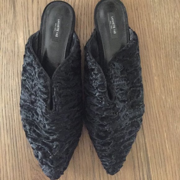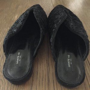 *****PRICE DROP***** Slide on, flat, black mules with V-cut vamp; 1" heel.