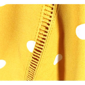 This is a beautiful pre-owned, flowy, sleeveless Layne Bryant top in mustard yellow with white polka dots. The bodice is fully lined, so the cut-out detailing on the front is not see-through. The shirt also features a figure-flattering peplum.