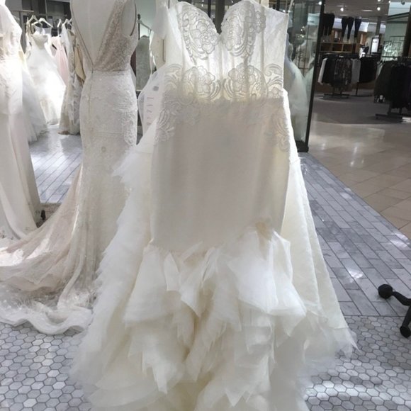 NEW and unworn Lazaro trumpet gown featuring ivory crepe skirt with layered ruffled organza finish, chapel train, gorgeous sheer corseted Chantilly lace on the bodice, and a sweetheart neckline.