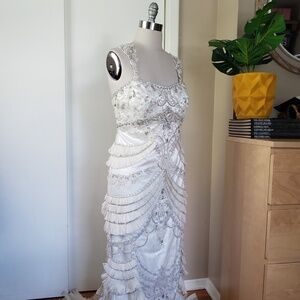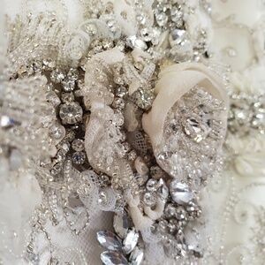 Design/Details: Stunning art-deco inspired wedding gown with intricate crystal beaded details. Own your moment in this beautiful organza ruffled tier skirt, beaded straps, and sweeping train. This gown was hand-embroidered so the intricate pattern is unique to this dress. Your special day deserves a special dress!