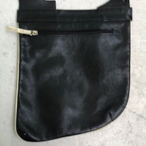 Black leather bag that’s constructed like a saddle bag. One side leather one side nylon, as you see 1/2 of it needs to be clean. This is a nice vintage bag that is in good condition otherwise. Measures approximately 9 1/2 x 11
