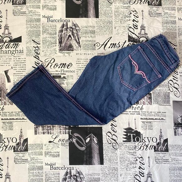 These denim capris from Lazer Jeans are pretty cool! They're from the early/mid 2000s/y2k. They're dark wash and have pink contrast stitching. The pockets are functional. They're low/mid rise. They're in great condition with no rips, stains, or tears. Tagged as a size 5