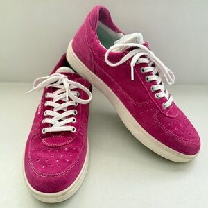 The Hypernova is Lazo's first contemporary, skate-inspired low top. Outfitted with an eco-friendly suede upper and white accent stitching, the Hypernova's toe box twinkles with a field of starbursts with the metallic insets. In color Supernova Pink and size 10. Gunmetal eyelets. Terry cloth liner is soft, comfortable, breathable and 100% biodegradable. Minimal cushioning in the tongue and interior for a relaxed yet responsive fit. Removable insoles manufactured from recycled PU foam with a recycled fiber lining...comfy while providing impact absorption and superior rebound. Footbed is furnished with anatomically calibrated flow cap technology for all-day comfort. Lightweight, ThermoRubber cup sole (certified biodegradable) with galactic tread. Outsole provides excellent traction and maneuverability. Pre-loved in good condition.