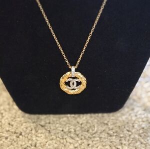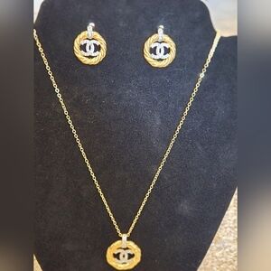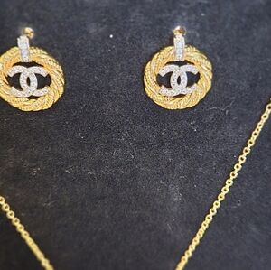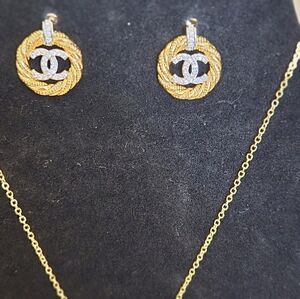 Elegant gold and silver jewelry set featuring a necklace and matching earrings. Perfect for adding a touch of luxury to any outfit.