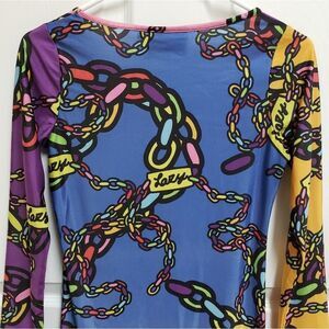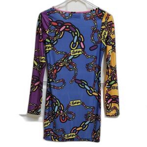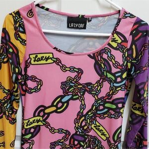 Lazy Oaf Dress Womens Medium Pink Blue Multicolor Chain Print Stretchy Bodycon Wearable Art Modern Contemporary