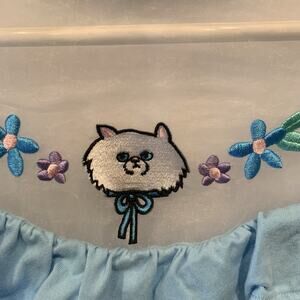 This is a Lazy Oaf Grumpy Cat Mesh Ruffle top in powder blue, size small. It features short sleeves, embroidered accents, and a regular fit. The blouse has a tunic style and is suitable for casual occasions. Made of mesh fabric, it has a unique design with ruffle details.