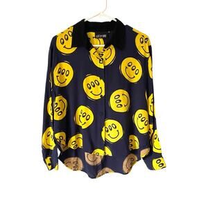 Lazy Oaf London Happy Face Navy Blue Yellow Button Down Shirt One Size o/s in excellent condition and. Oversized fit. Measurements laying flat chest 24 inches across and length 23 inches long