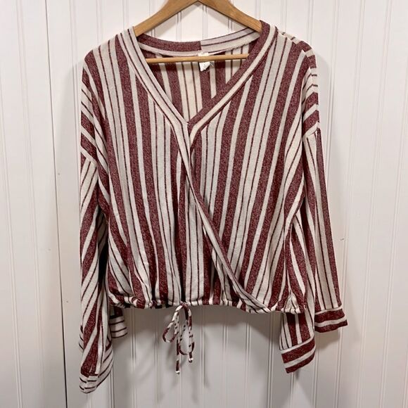 Lazy Sundays by Paper Crane maroon and white striped bell sleeve v-neck faux wrap blouse