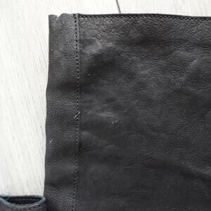 Leather over the knee boot. Elasticized leather back panels allow for clean custom fit. Exposed zip at ankle. Shaft can be pushed down below the knee for a slouchy look. Note, it is best to put this boot on by folding the shaft halfway and slipping foot in. Once boot is on your leg, roll the shaft up and over knee.