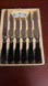 Elegant knife set with black handles and ornate silver detailing.