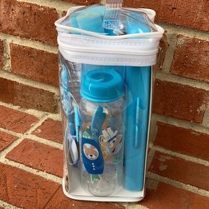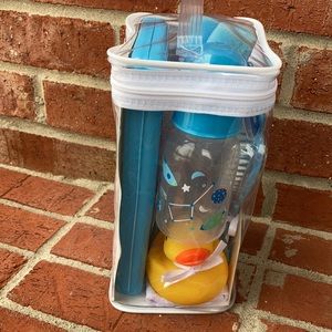 NWT Le Bebe Favorite “Space Travel” Baby Boy 10-Pc.Blue Gift Set, 8”High Plastic Package with Zipper Top, Set includes Medium Flow 9oz. & 5oz. Bottles, Wipe Case for WetOnes, Bottle Brush with Sponge Tip, Pacifier with Silicone Nipple & Cover, Squeeze Rubber Duck, Washcloth, Comb, Brush & Spoon, Accent Bow, Carrying Handle Top, BPA Free, 0+Months, Imported