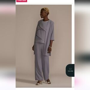 Le Bos lavender pant set. With neckline beading and asymmetrical tiers, the tank is the star of the show in this three-piece set. Any mother of the bride or groom is sure to stun in the effortless georgette fabric.