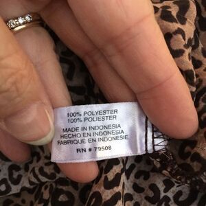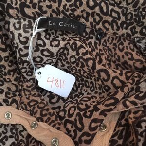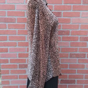 Beautiful leopard snap button closure button up top blouse with ribbon on front collar which hangs down over end of shirt. Very unique and eye catching. Excellent pre owned condition.