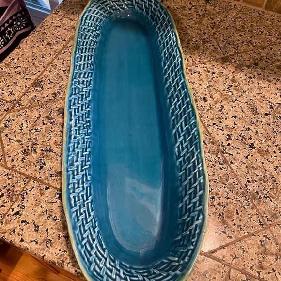 Just gorgeous! Turquoise ocean blue. Greenish edging. Ribbed edges. 21 inches long! Table center piece to fill with your favorite things! Or use as a serving platter. Truly stunning and made in Italy. No chips or cracks! Clean home always!