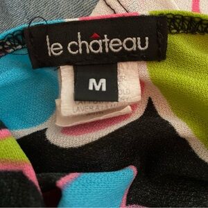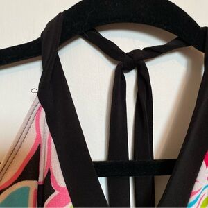 Vibrant halter top with a floral pattern. Features pink, green, and orange hues.