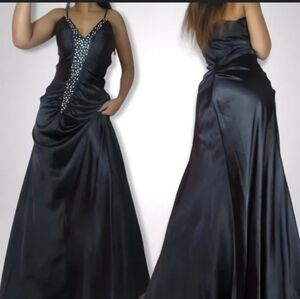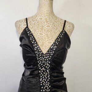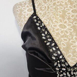 Le Cirque Women's Size M Black Rhinestone Embellished Ruched Satin Long Sleeveless V-Neck Lined Adjustable Strap Side Zip Closure Evening Ball Gown Dress Formal Party Gently Pre-Owned Excellent Condition Reasonable Offers Welcome