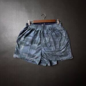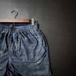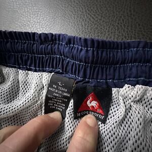 Vintage Le Coq Sportif striped swim trunks with all-over print. Euro sport style perfect for sand soccer, lounging, or retro athletic looks. Lightweight and quick-drying.
