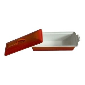 le creuset, cast iron terrine, orange casserole, vintage baker, 1.5 quart pot, french bakeware, enameled cookware, meatloaf pan, bread baker, oven dish, lasagna pan, retro kitchenware