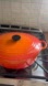Experience superior cooking with this Le Creuset Flame Dutch Oven. Ideal for braising, baking, and more. Its vibrant hue enlivens any kitchen. Gently used. Please see photos for slight signs of use. In great condition still!