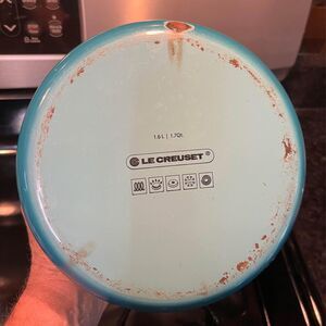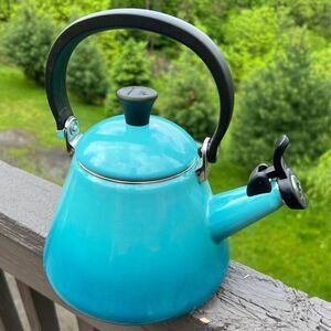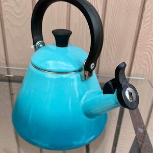 High-quality Le Creuset Turquoise Ombre 1.6 Qt Enamel-On-Steel Whistling Tea Kettle in good pre-owned condition. Minor wear only from general use. Cleaned and ready for a new home.